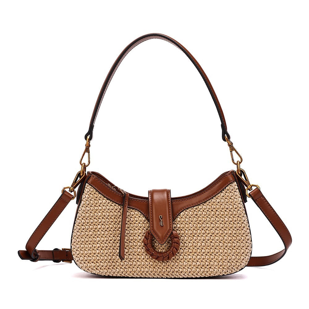 Combine a Bolsa Baguete Santa Lolla Bege Tramada Alça Dupla com vestidos leves, conjuntos de linho ou jeans e blusas básicas para um look casual chic. Para um toque mais sofisticado, aposte em peças monocromáticas ou tons terrosos que harmonizem com o acabamento bege e marrom da bolsa. Finalize com sandálias rasteiras ou mules para um visual moderno e elegante.