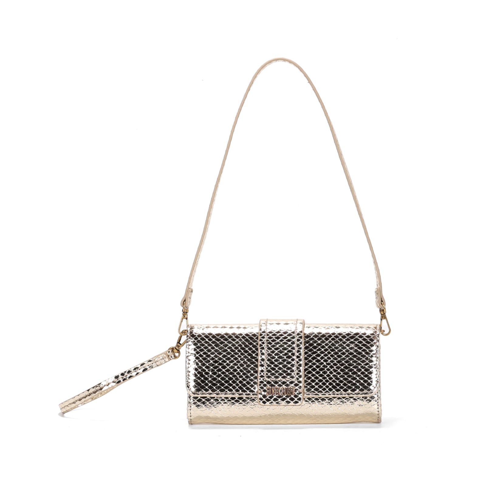 Explore o estilo único da Bolsa Transversal Santa Lolla Dourada Metalizada. Esta bolsa carteira possui um acabamento metalizado com textura amassada, trazendo um toque moderno e arrojado ao seu visual. Com duas alças removíveis, ela oferece praticidade no uso, além de um fechamento em ímã para manter seus pertences seguros. Suas dimensões compactas de 20cm de comprimento, 10cm de altura e 5cm de profundidade são perfeitas para carregar apenas o essencial.
