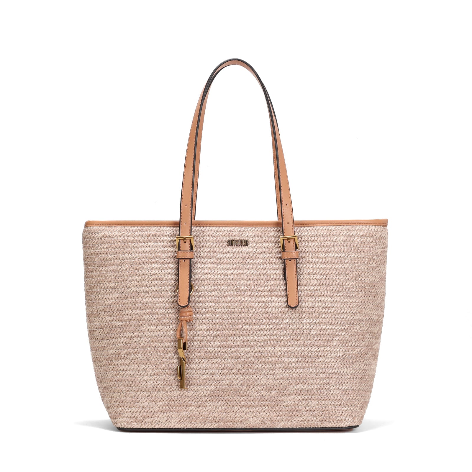 A Bolsa Sacola Santa Lolla, com design em palha tramado e cor bege, apresenta alça com detalhe em fivela, combinando modernidade e elegância. Espaçosa, as dimensões são 33cm de comprimento, 28cm de altura e 14cm de profundidade.