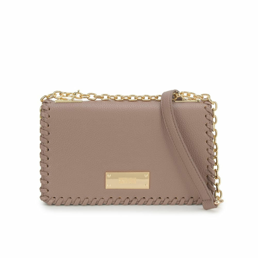 Bolsa Santa Lolla cor taupe (nude) tipo tiracolo. Conta com alça em correntaria dourada e trama nas extremidades.