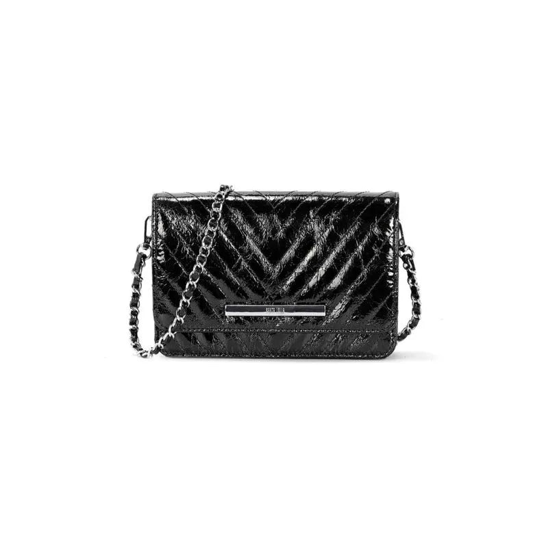 Bolsa pequena confeccionada em material metalizado crinkle e acabamento em costura matelassê. Modelo em formato quadrado com alça transversal de corrente, possui compartimento interno ideal para armazenar itens essenciais. Conta com placa frontal metalizada com o logo da marca e fechamento em imã.