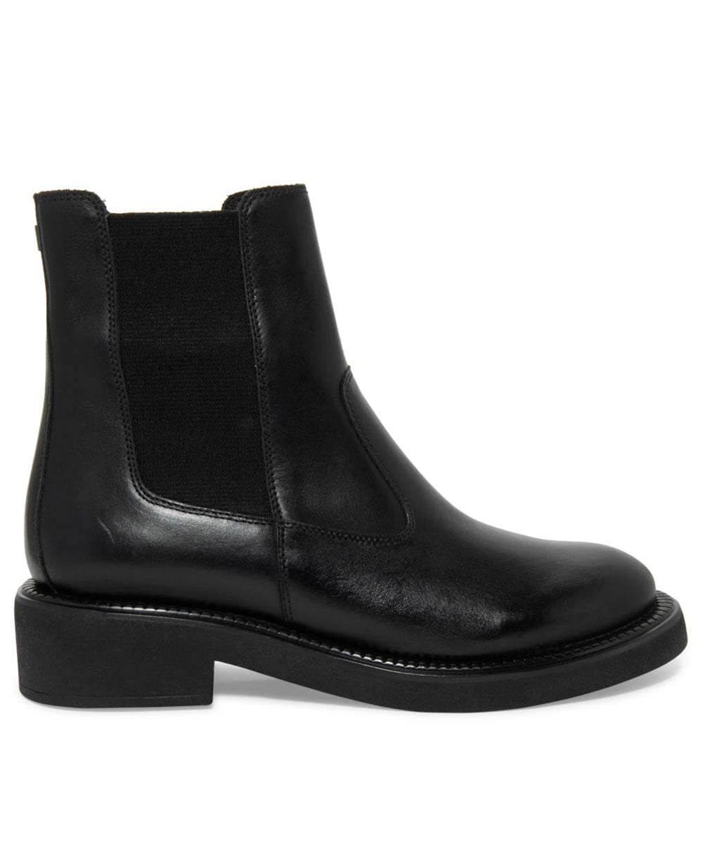 Bota chelsea preta, confeccionada em couro confort, possui salto bloco baixo para proporcionar um visual elegante e confortável.