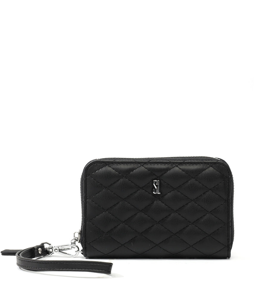 Carteira Santa Lolla preta pequena acabamento matelassê. Possui divisórias de cartão, moeda e notas e alça de mão.