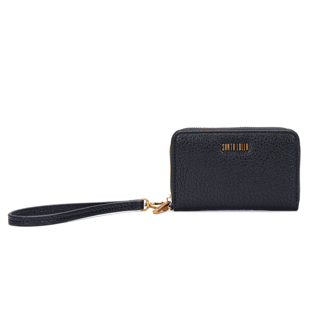 Elegante e prática, a Carteira Santa Lolla é confeccionada em couro floater preto, destacando a logo da marca em metal dourado na parte frontal. Equipada com alça de mão e fecho em zíper, é perfeita para acomodar seus itens essenciais com segurança.