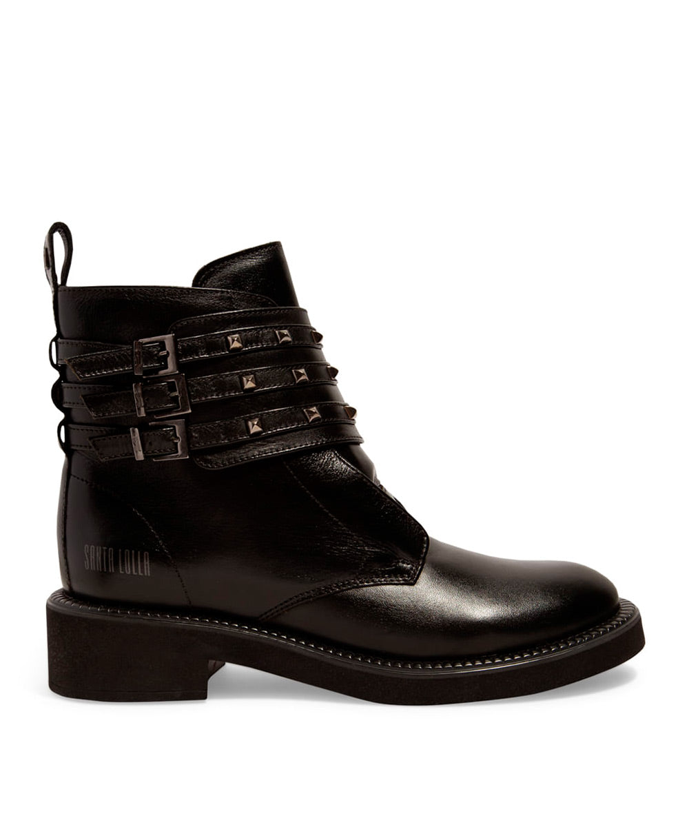 Bota de couro confort preta, possui detalhes de spikes na tira e fechamento de fivela, oferecendo um toque marcante e moderno ao seu visual.
