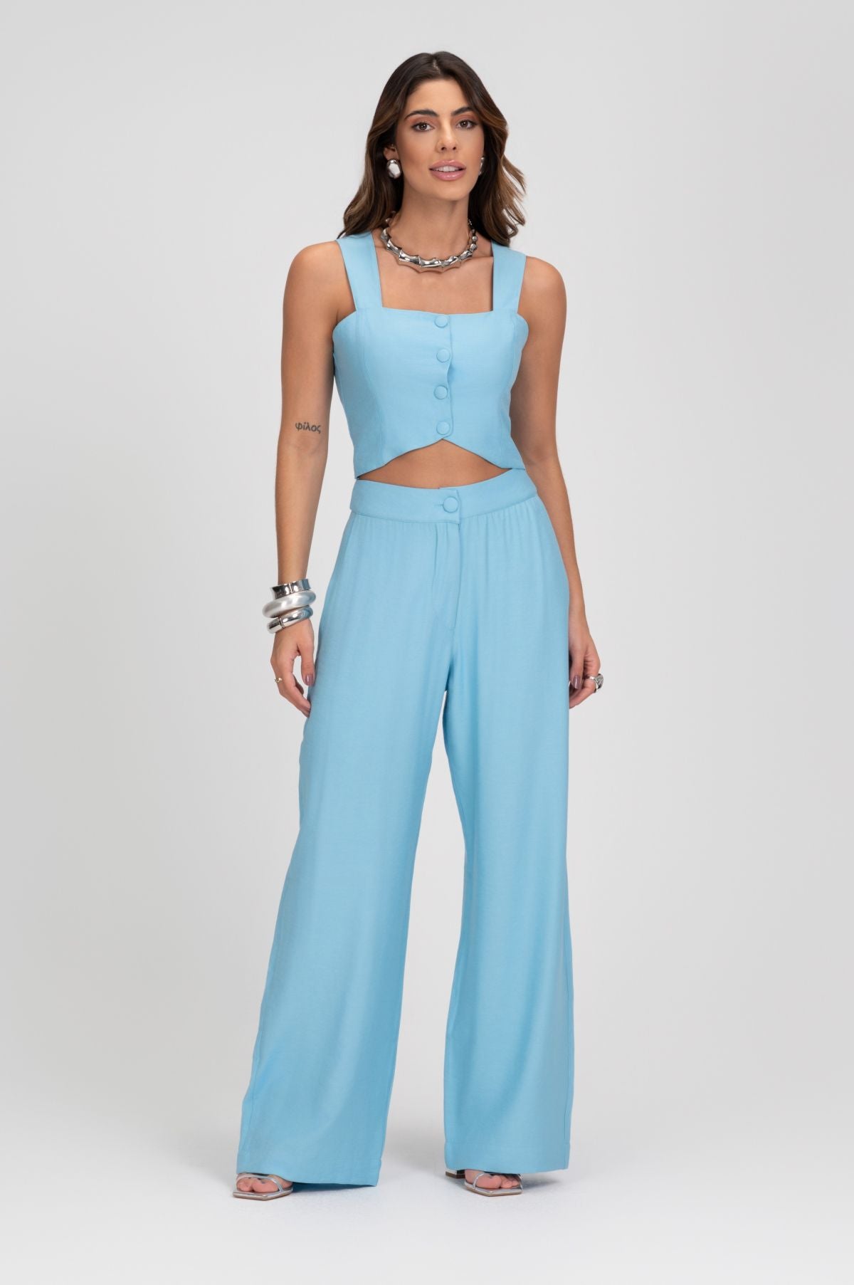 Combine o Cropped Alfaiataria Azul Alças Largas Frysaide com uma calça de alfaiataria para um look sofisticado e alinhado, ou opte por uma saia midi para um visual mais feminino e delicado. Para um estilo casual chic, experimente com um short de cintura alta e sandálias de tiras. Finalize com acessórios prateados ou dourados para um toque de brilho e modernidade.