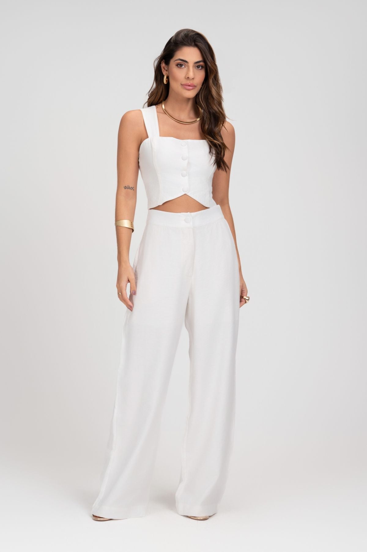 Combine o Cropped Alfaiataria Off White Alças Largas Frysaide com uma calça de alfaiataria para um look clássico e refinado, ou aposte em uma saia midi para um visual mais feminino e romântico. Para um toque despojado, use com shorts de cintura alta e finalize com acessórios dourados ou prateados para um brilho extra. Complete o look com sandálias de salto ou tênis para um estilo mais casual.