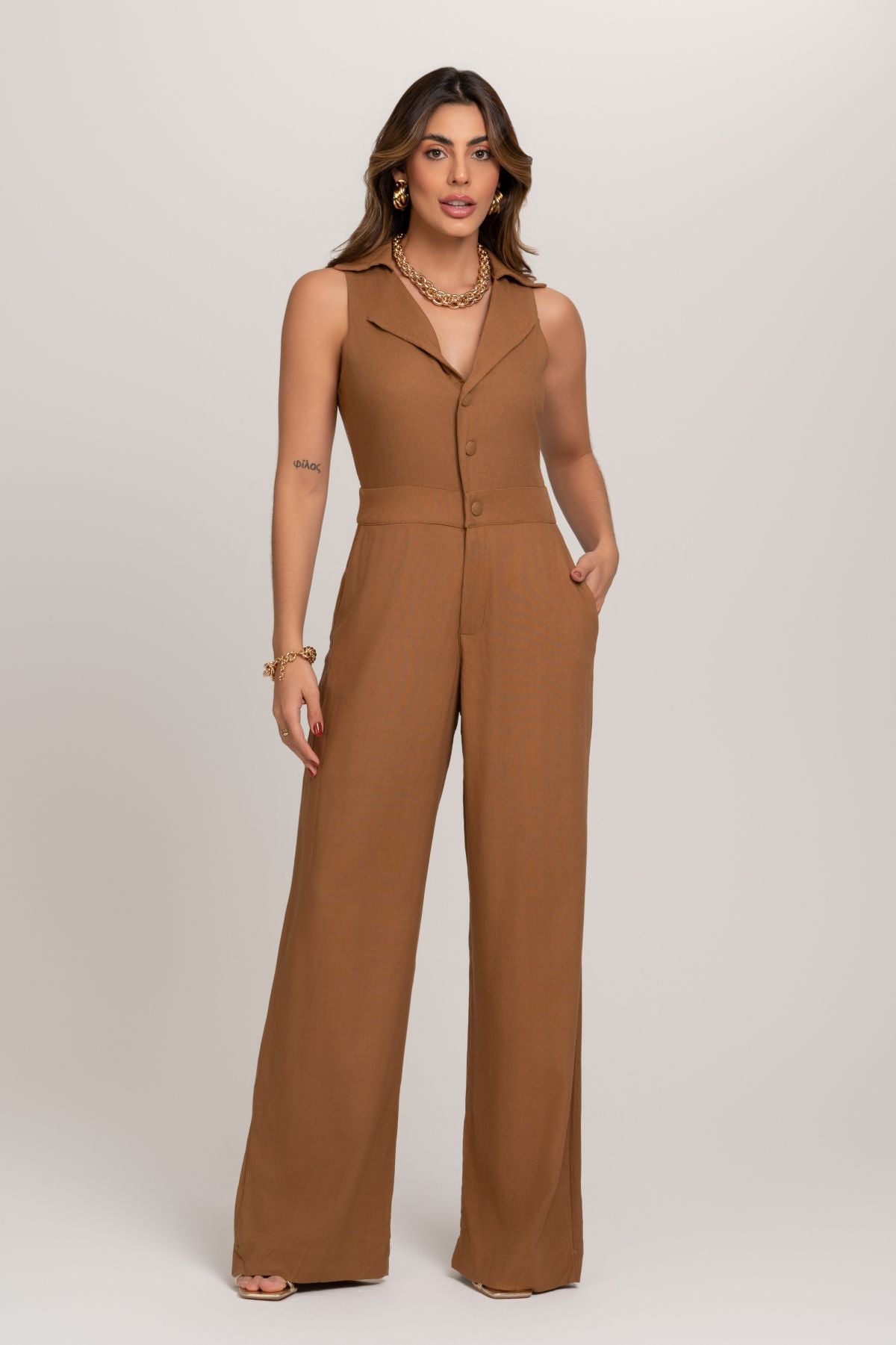 Combine o Macacão Marrom De Linho Frente Única Frysaide com acessórios dourados para um toque de glamour ou com peças em tons neutros para um visual minimalista. Uma jaqueta de couro ou blazer estruturado pode ser adicionada para compor um look mais sofisticado. Nos pés, opte por sandálias de tiras ou mules para um acabamento moderno e elegante.
