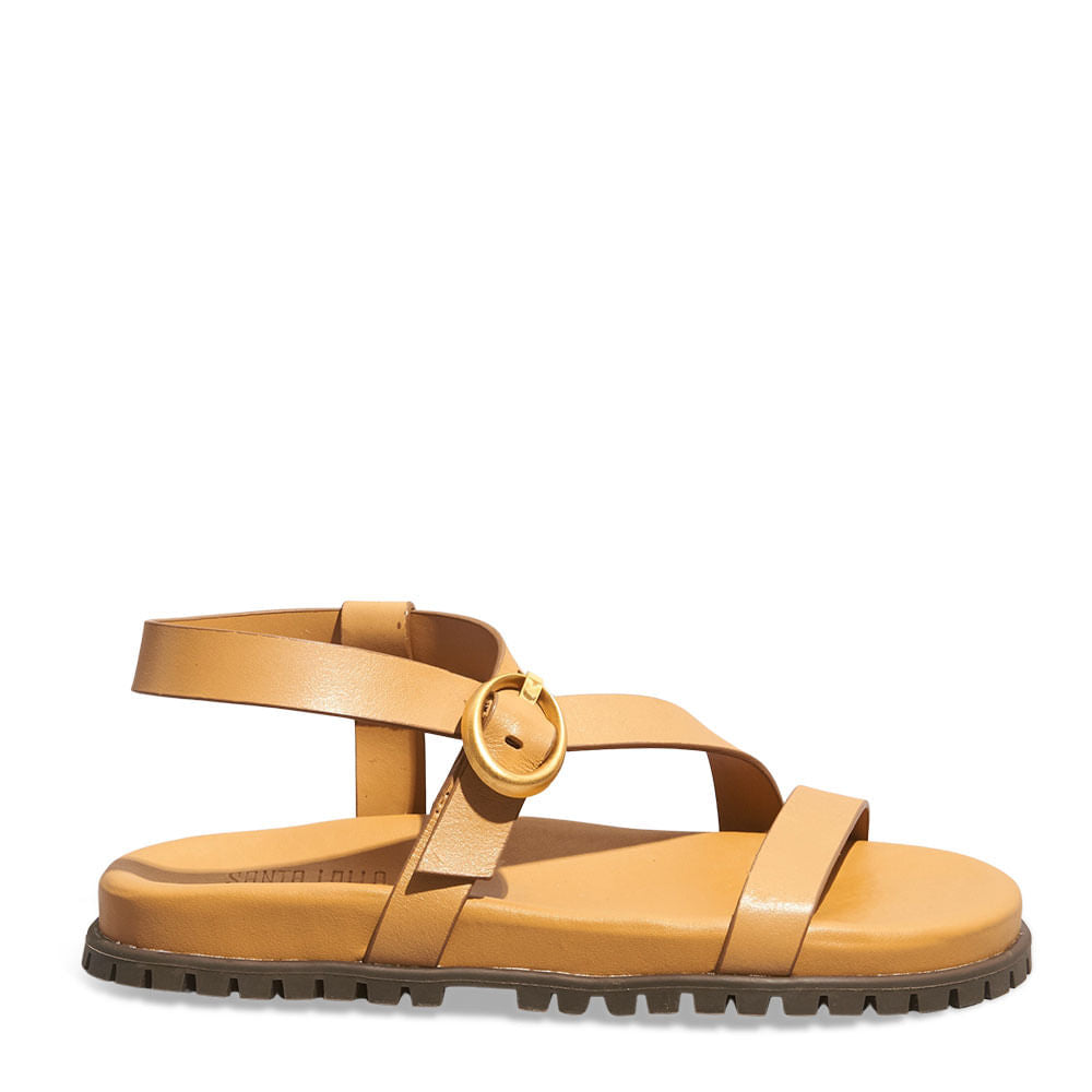 A Papete Santa Lolla apresenta um design moderno com seu couro marrom nobre e solado tratorado, complementados por tiras largas que garantem ajuste seguro e confortável.