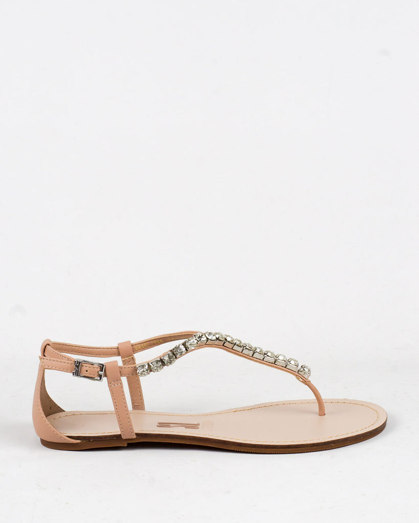 Rasteira Santa Lolla cor nude e tiras trabalhadas em pedraria na cor cristal. Conta com calcanhar fechado e fechamento por fivela. Aposte para montar looks arrumados e despojados.