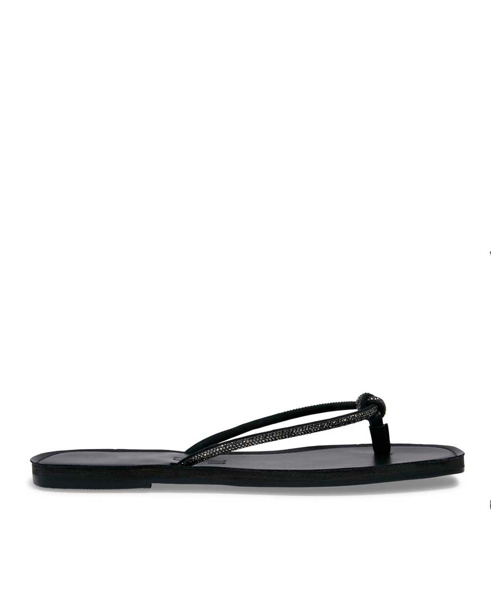 Rasteira Santa Lolla preta com tiras de strass e solado flat. Confortável e elegante, ideal para compor looks casuais em dias quentes com muito estilo.