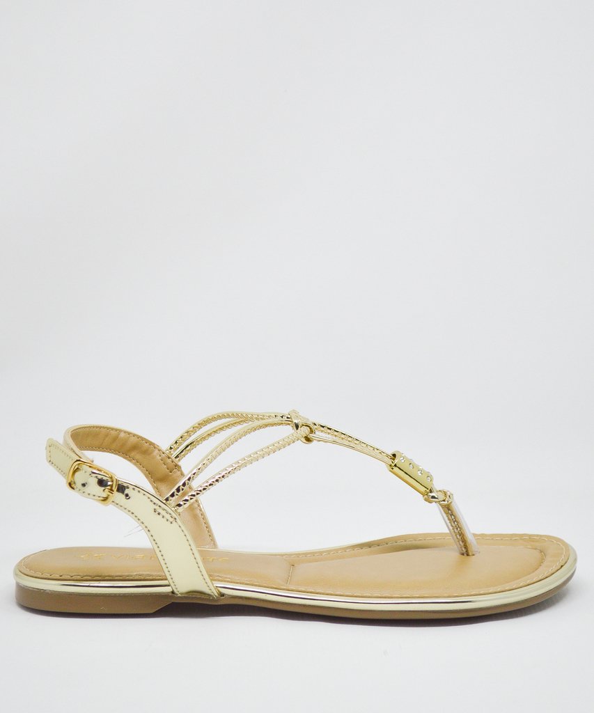 Rasteirinha feminina dourada metalizada Via Marte tiras duplas. Possui fechmaneto por fivela, solado flexível para maior conforto ao caminhar e palmilha com alta absorção de impacto.