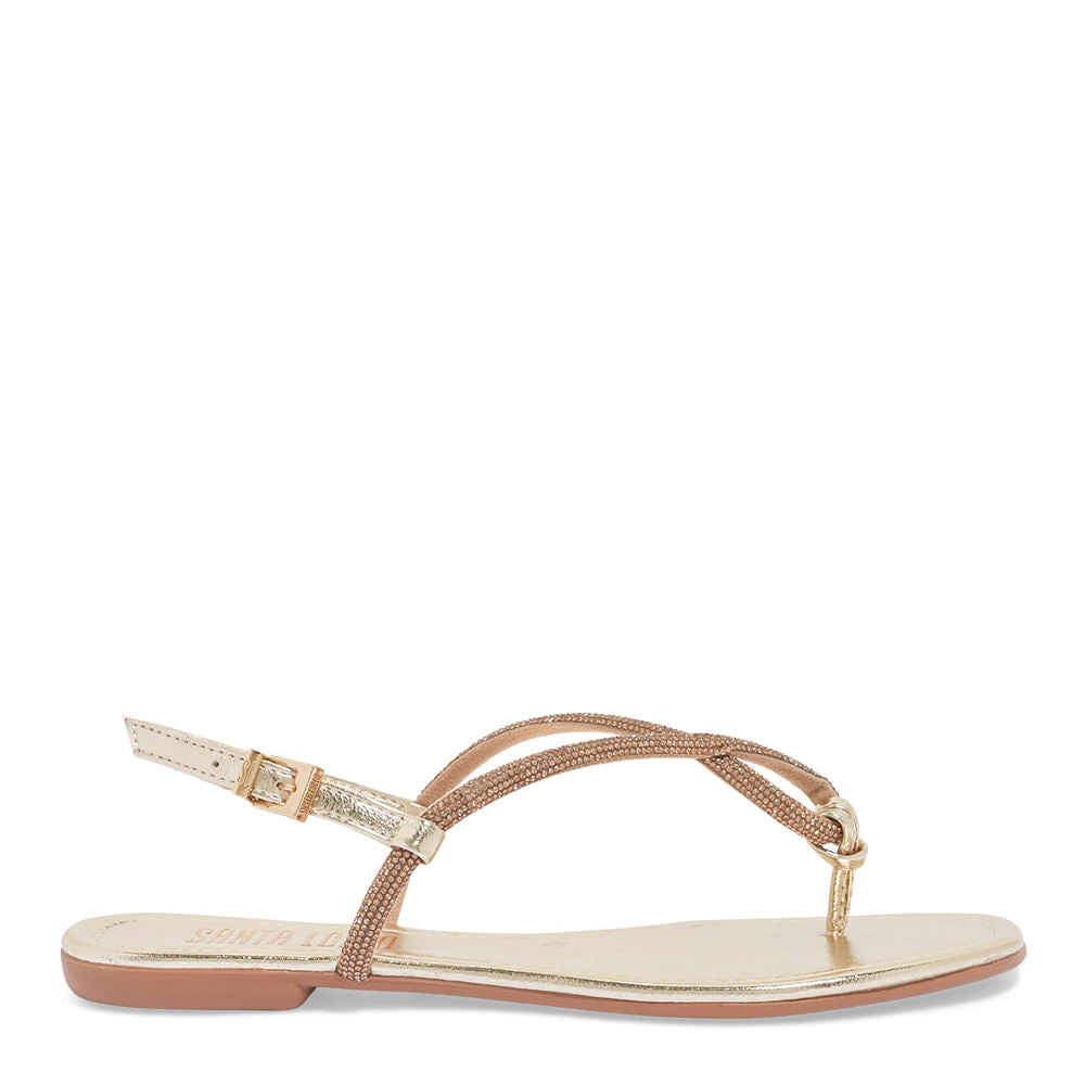 A Rasteira Flat Santa Lolla em tom dourado é confeccionada em material soft metalizado, apresentando um design contemporâneo que se destaca em qualquer visual. As tiras cruzadas com strass oferecem um brilho elegante e sofisticado, tornando esta rasteira um acessório ideal para completar o seu look.
