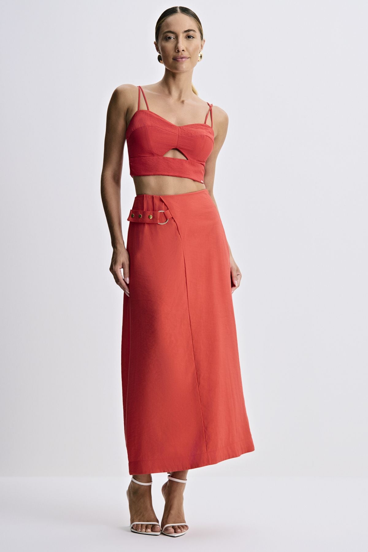 Para criar um look equilibrado e estiloso, combine a Saia Maxi Midi Vermelha Meia Loka com peças que valorizem sua modelagem e cor vibrante. Tops ajustados ou blusas cropped são ideais para destacar a cintura alta. Nos pés, opte por sandálias de salto fino para um visual elegante ou tênis minimalistas para um toque despojado. Finalize com acessórios dourados ou prateados para realçar o detalhe metálico da saia e criar um visual harmônico.
