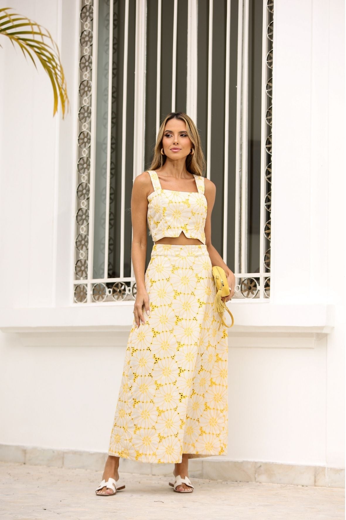 Explore o charme da Saia Midi Frysaide Amarela, confeccionada em tecido leve com bordados delicados. A cor amarela confere frescor e estilo ao seu guarda-roupa.