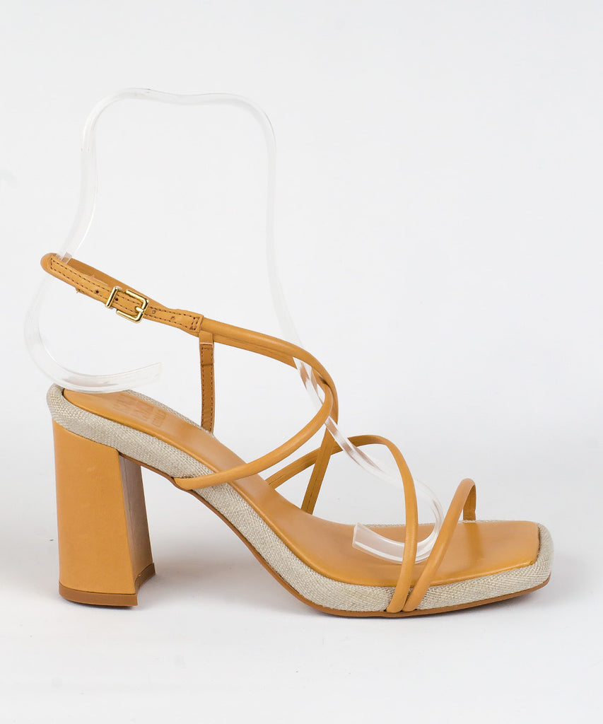 Sandália salto bloco Degalls caramelo confeccionada em couro. Conta com tiras modernas e vira em linho. Maravilhosa.
