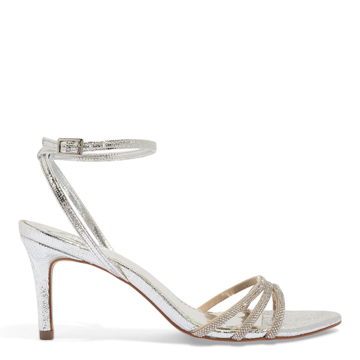 Esta elegante sandália Degalls prateada é a escolha ideal para quem deseja sofisticação. Fabricada com material sintético, ela apresenta um design moderno com bico redondo e tiras finas adornadas com brilho. Seu salto fino médio traz um toque de glamour a qualquer look.