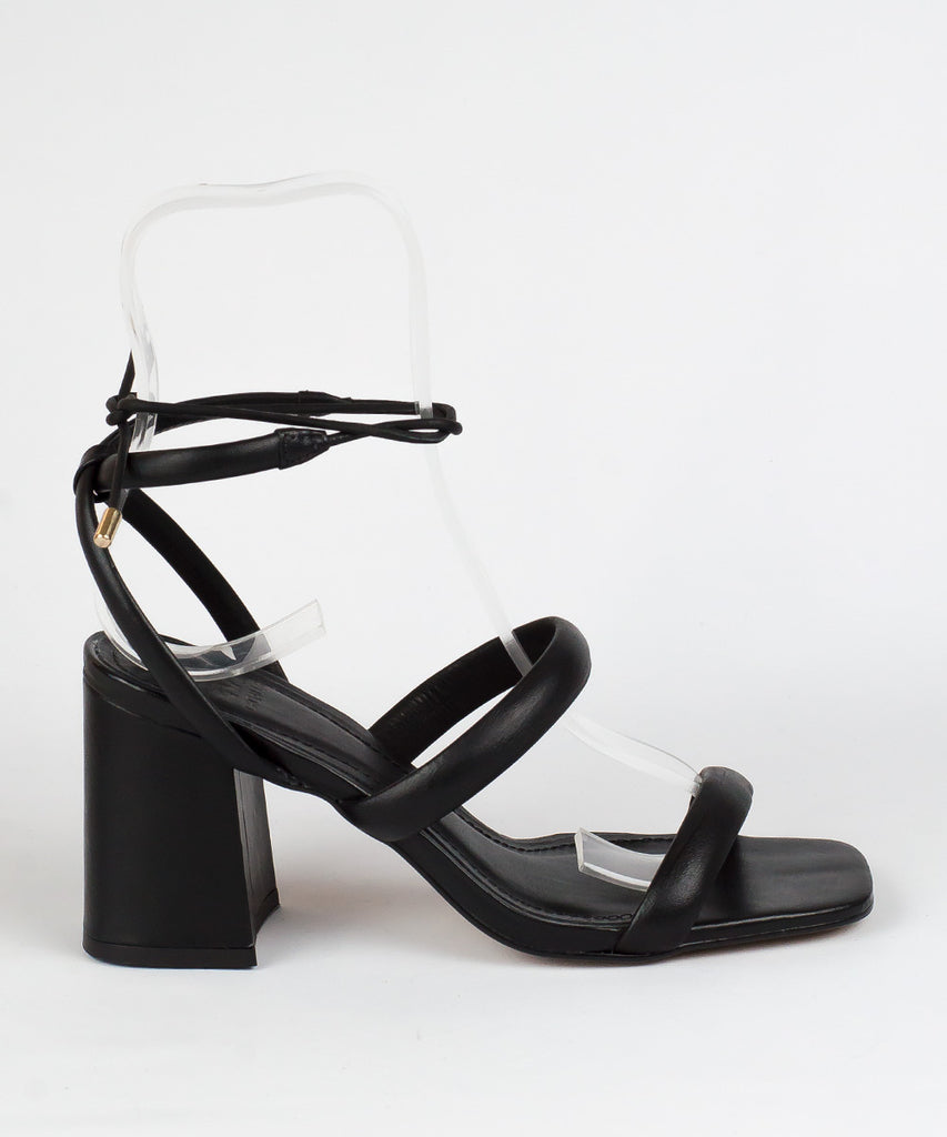 Sandália Degalls preta salto bloco confeccionada em couro. Conta com tiras no cabedal e fechamento em amarração.