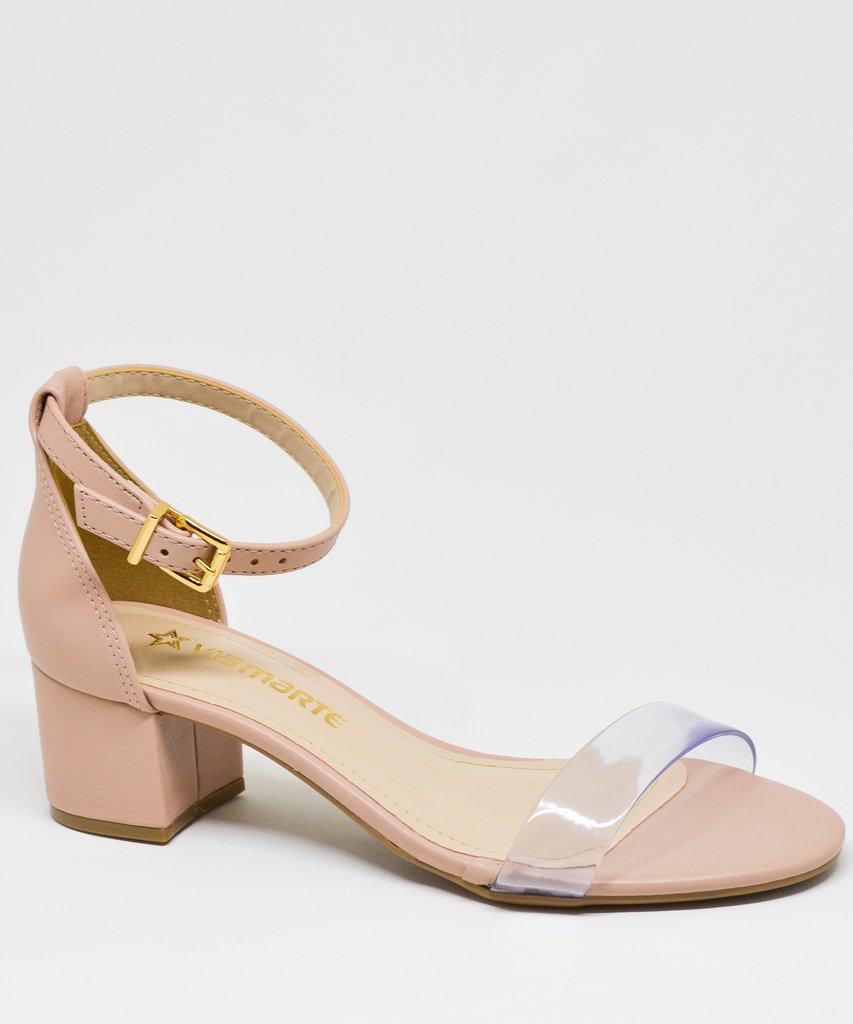 Sandália feminina nude Via Marte com tira em vinil transparente, salto baixo grosso confeccionada em napa. Possui fechamento por fivela, palmilha macia e solado antiderrapante.