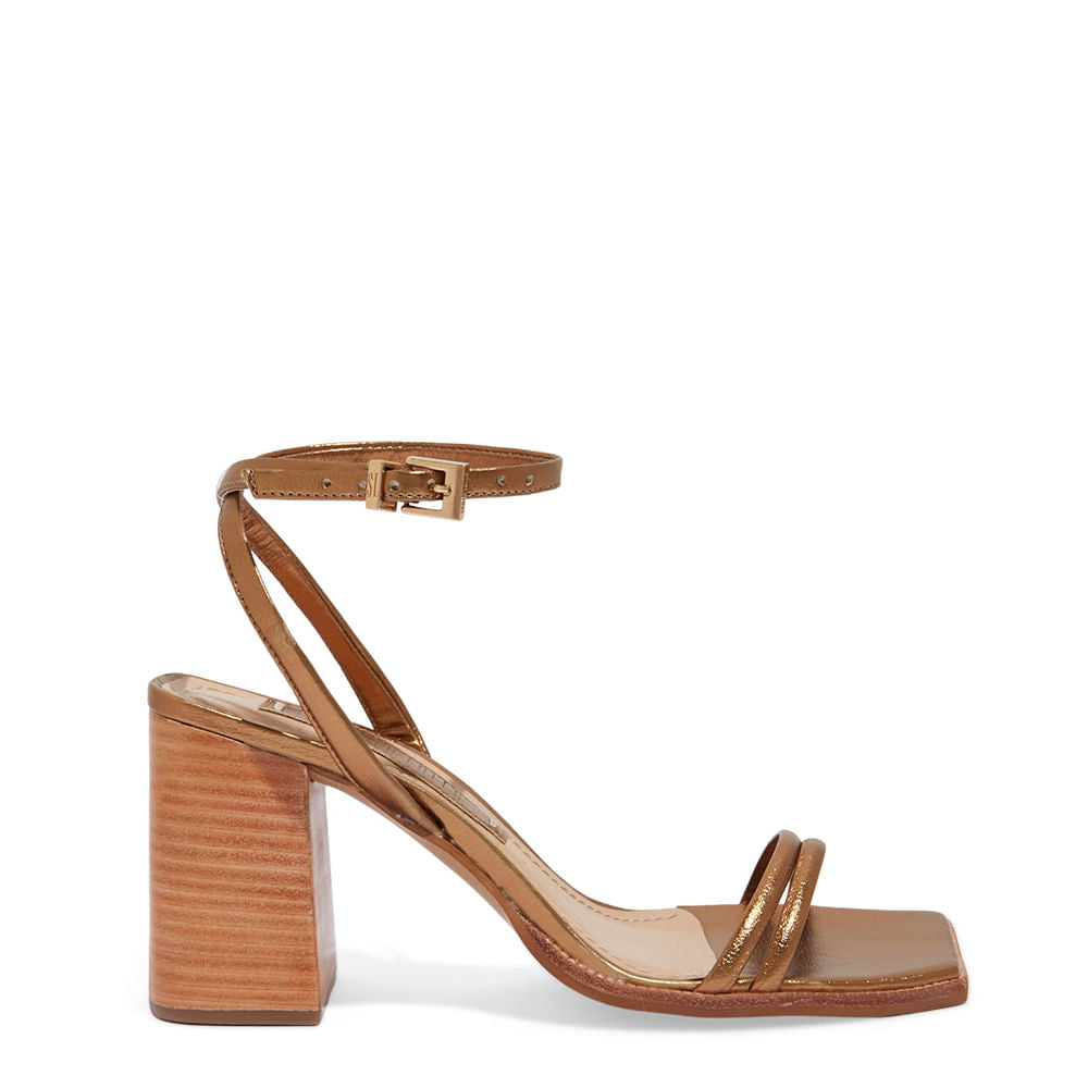 Esta Sandália de Bico Quadrado em bronze é produzida com material metalizado, oferecendo um design moderno e sofisticado. Possui salto bloco alto fachetado, e delicadas tiras finas sobre o cabedal, além de uma tira ajustável para fechamento com fivela que contorna o tornozelo.Características