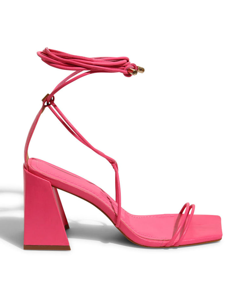 Sandália Santa Lolla cor rosa hibisco fechamento em amarração. Conta com salto alto grosso moderno e elegante. Aposte!