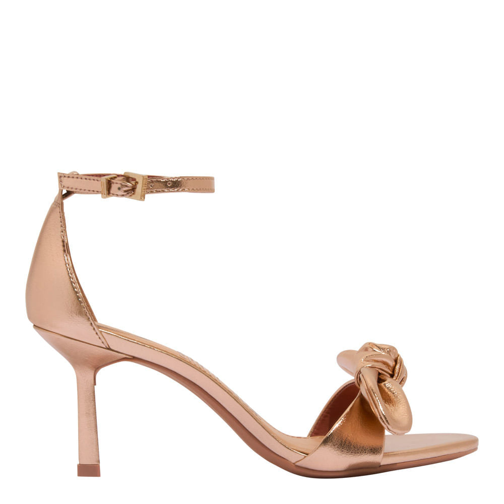 Esta sandália deslumbrante da Santa Lolla é confeccionada em material metalizado, apresentando um design elegante e moderno. Com um salto fino de altura média, a sandália assume uma cor bronze brilhante que atrai todos os olhares. O modelo conta com tiras elegantes e uma alça ao redor do tornozelo, com fecho de fivela, e uma tira larga frontal com detalhe de nó sofisticado.