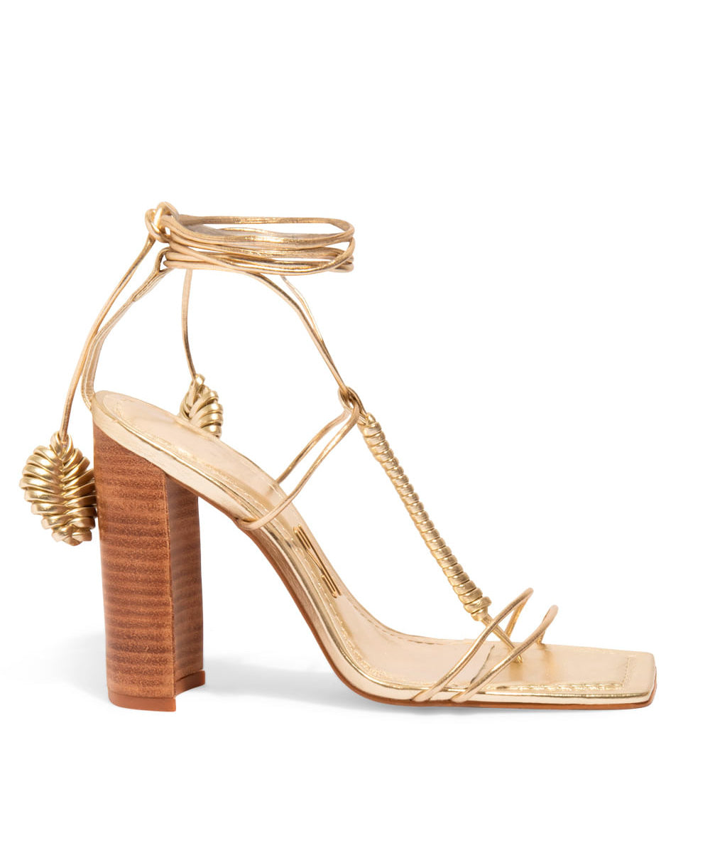 Sandália dourada, confeccionada em material mettalic soft. Possui salto alto bloco, tiras finas que passam pelo peito do pé, contornam o tornozelo e fecham em amarração superior.