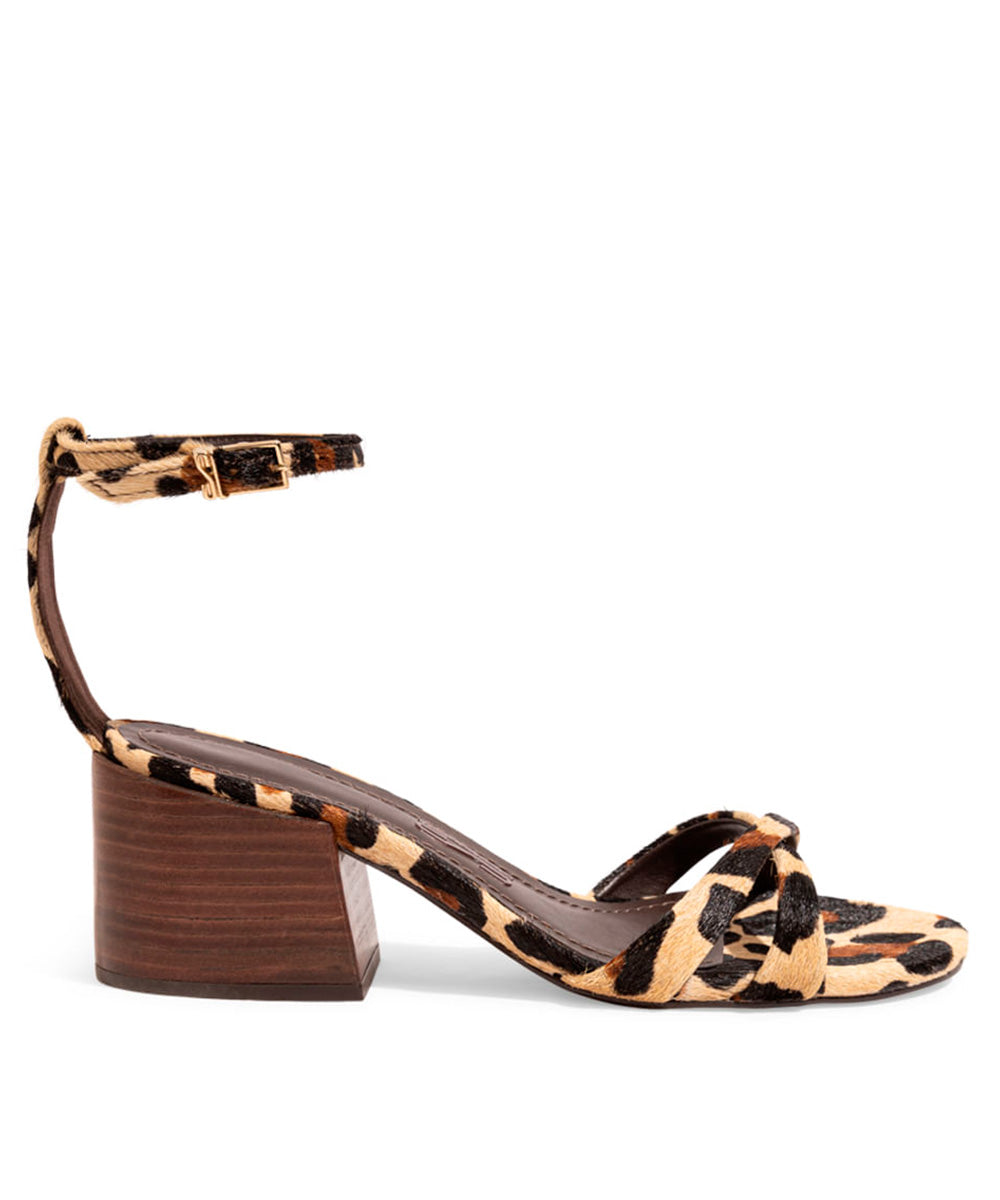 Sandália animal print, confeccionada em material couro pelo estampa onça. Traz a parte traseira à mostra, salto bloco baixo e bico redondo. As tiras cruzadas na parte do cabedal adicionam um toque de sofisticação ao calçado