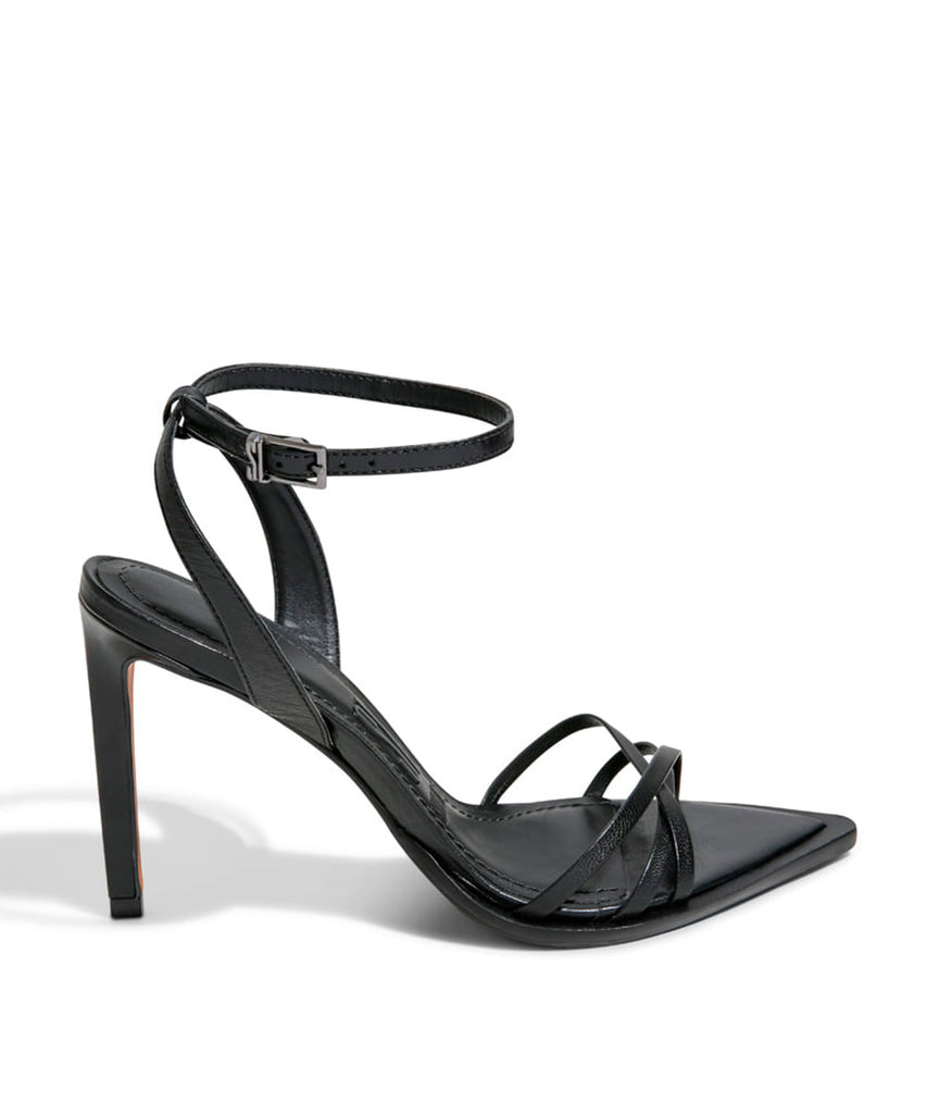 Sandália Santa Lolla preta salto alto fino. Modelo moderno, conta com bico folha e tiras trabalhadas no cabedal. Confeccionada em couro e fecho em fivela.