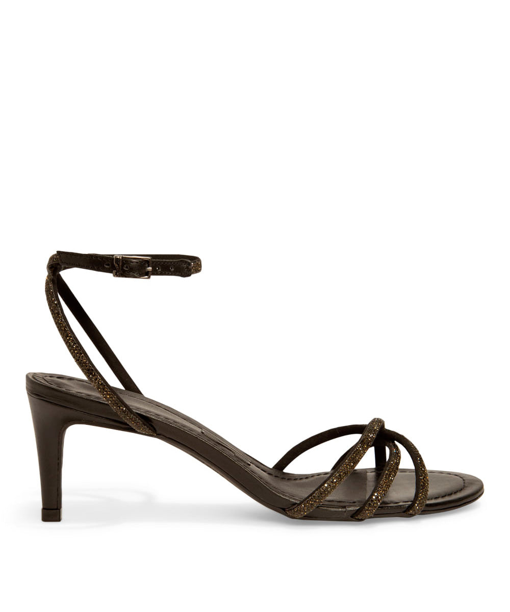 A sandáia de couro, possui salto fino baixo e tira que cruza o calcanhar, com fechamento em fivela e brilhos sitilantes nas tiras. Essa sandália oferece não apenas glamour, mas também um ajuste seguro e confortável ao caminhar.