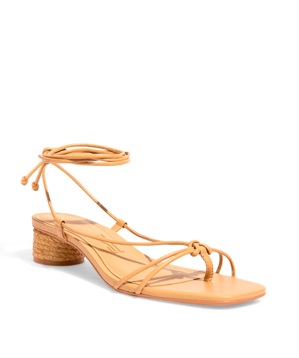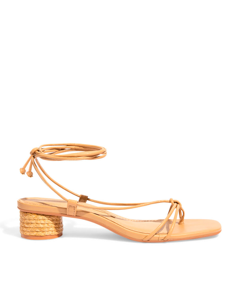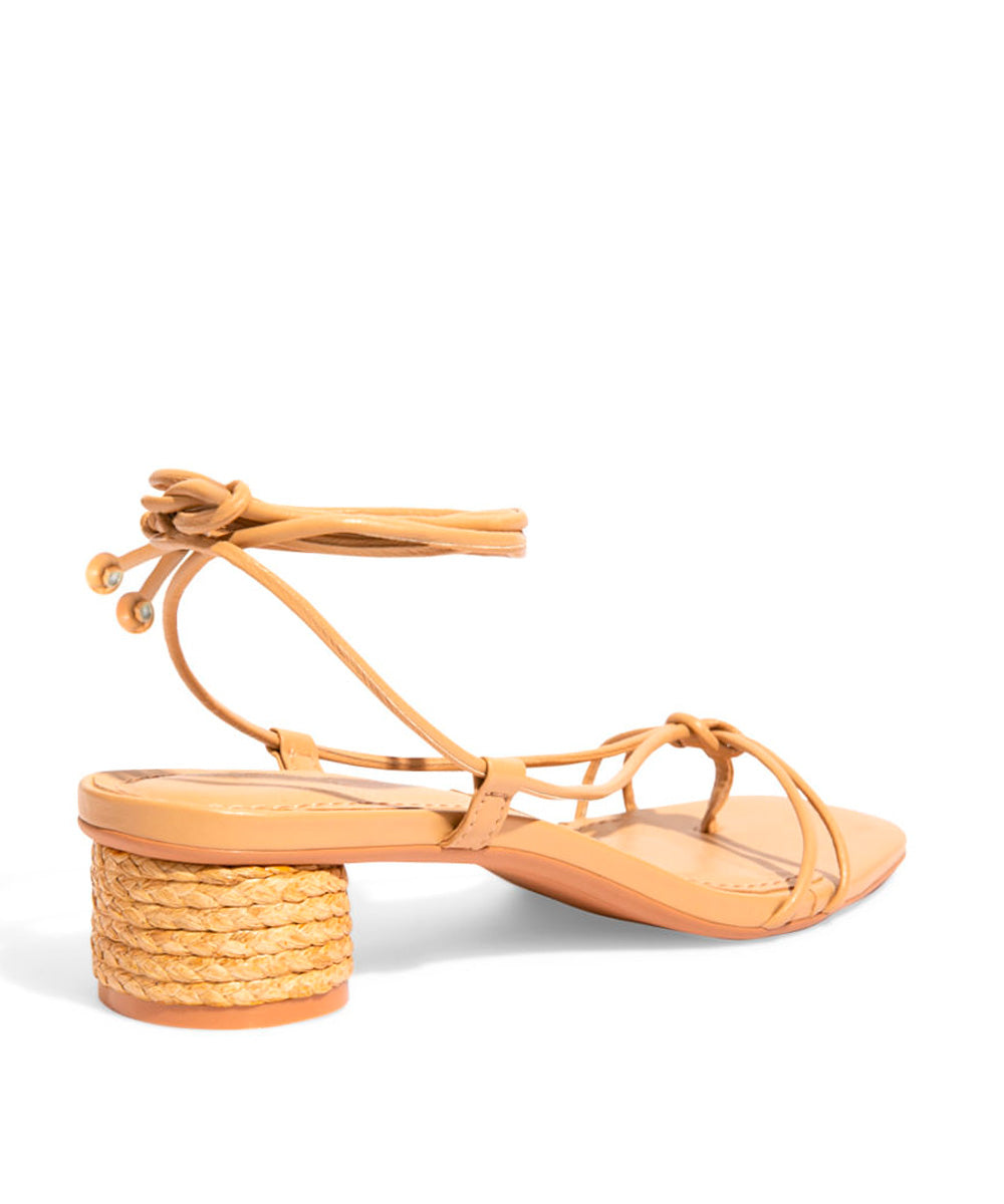 Sandália bege bico quadrado, confeccionada com material napa soft. Possui tira para amarração no tornozelo, salto bloco baixo com acabamento em corda e tiras entrelaçadas na parte frontal. Está sandália é perfeita para complementar looks casuais e despojados.