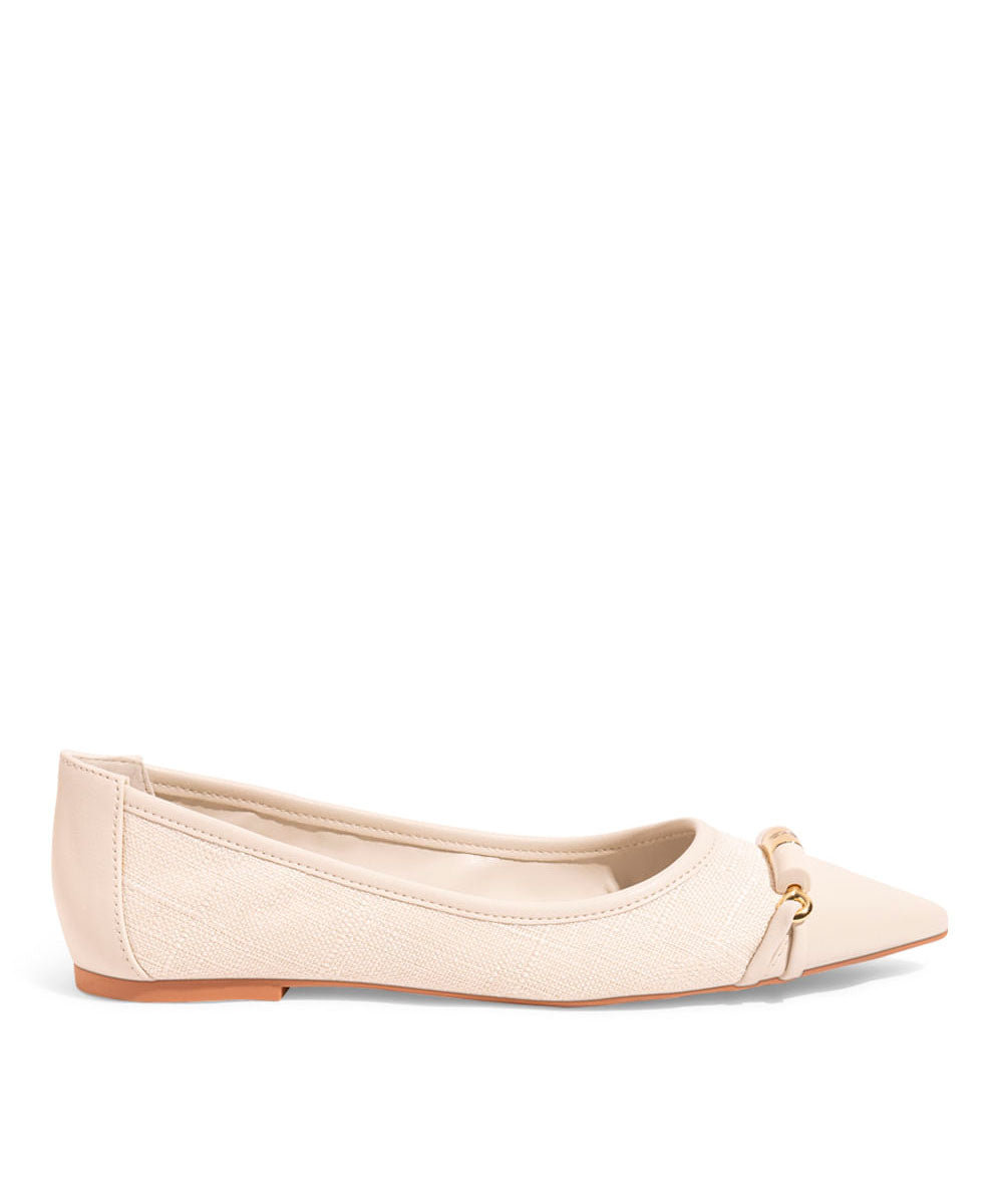 Sapatilha bico fino, confeccionada com material linho gaudi, possui detalhes em metal dourado na parte frontal que proporciona uma estética única, destacando-se pela sua forma elegante e moderna.