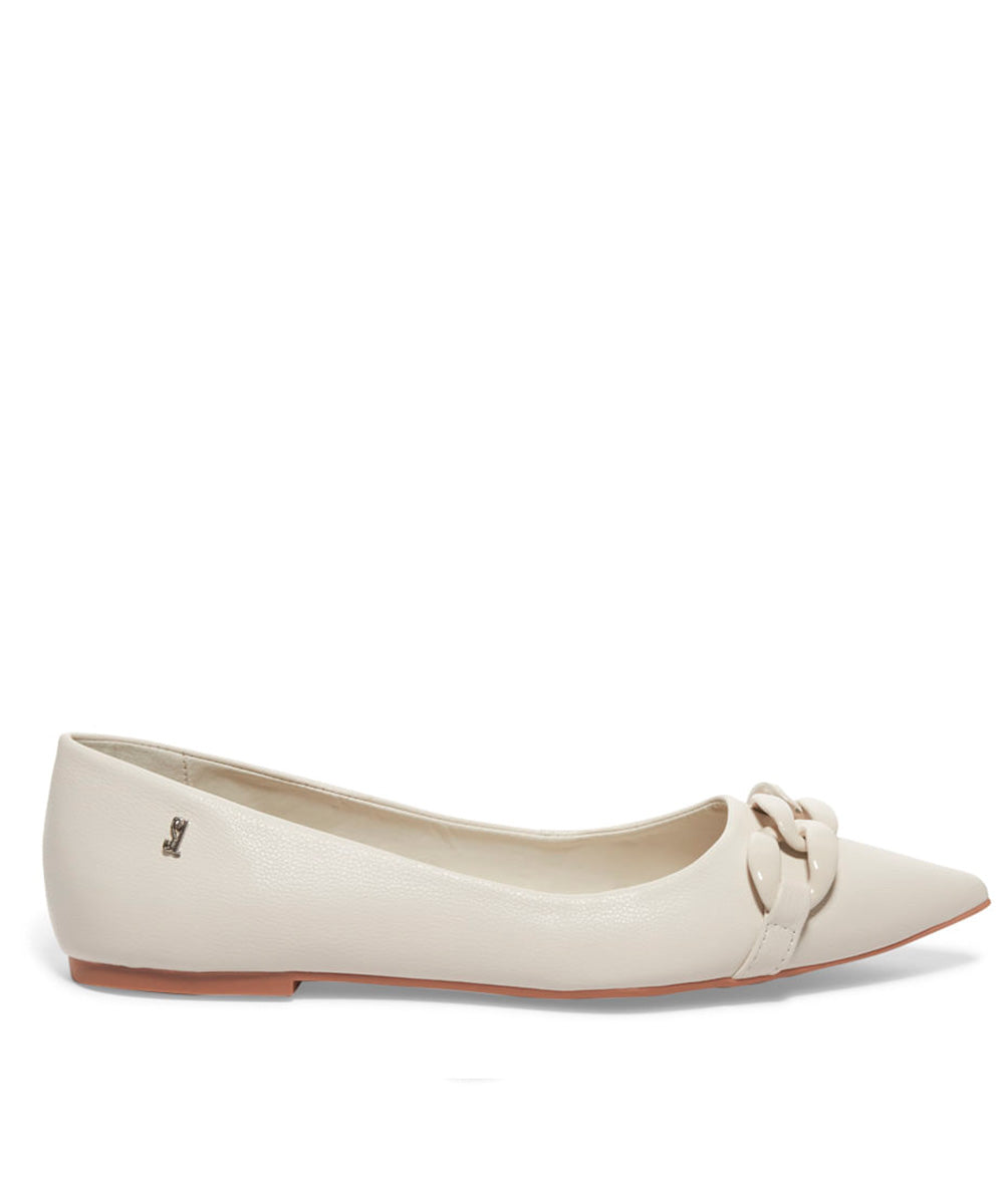 Sapatilha off white bico fino, confeccionada com material napa soft, possui corrente frontal que proporciona uma estética única, destacando-se pela sua forma elegante e moderna.