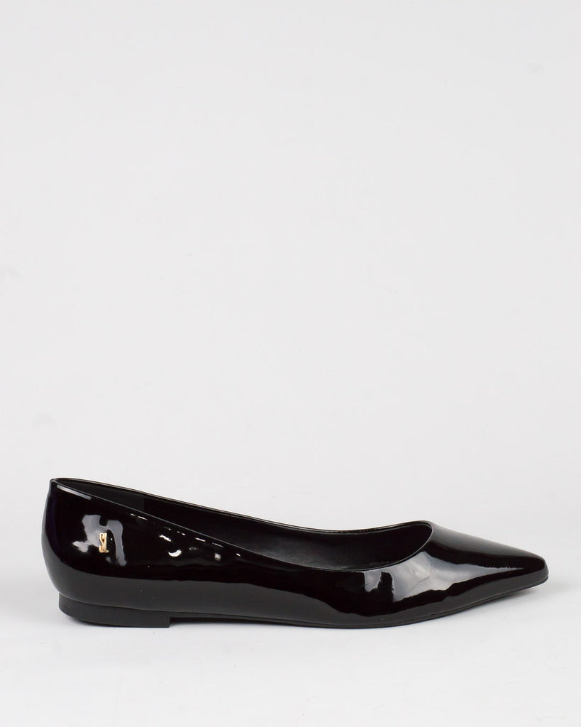 Sapatilha Santa Lolla preta lisa verniz bico fino. Ideal para looks casuais do dia a dia.