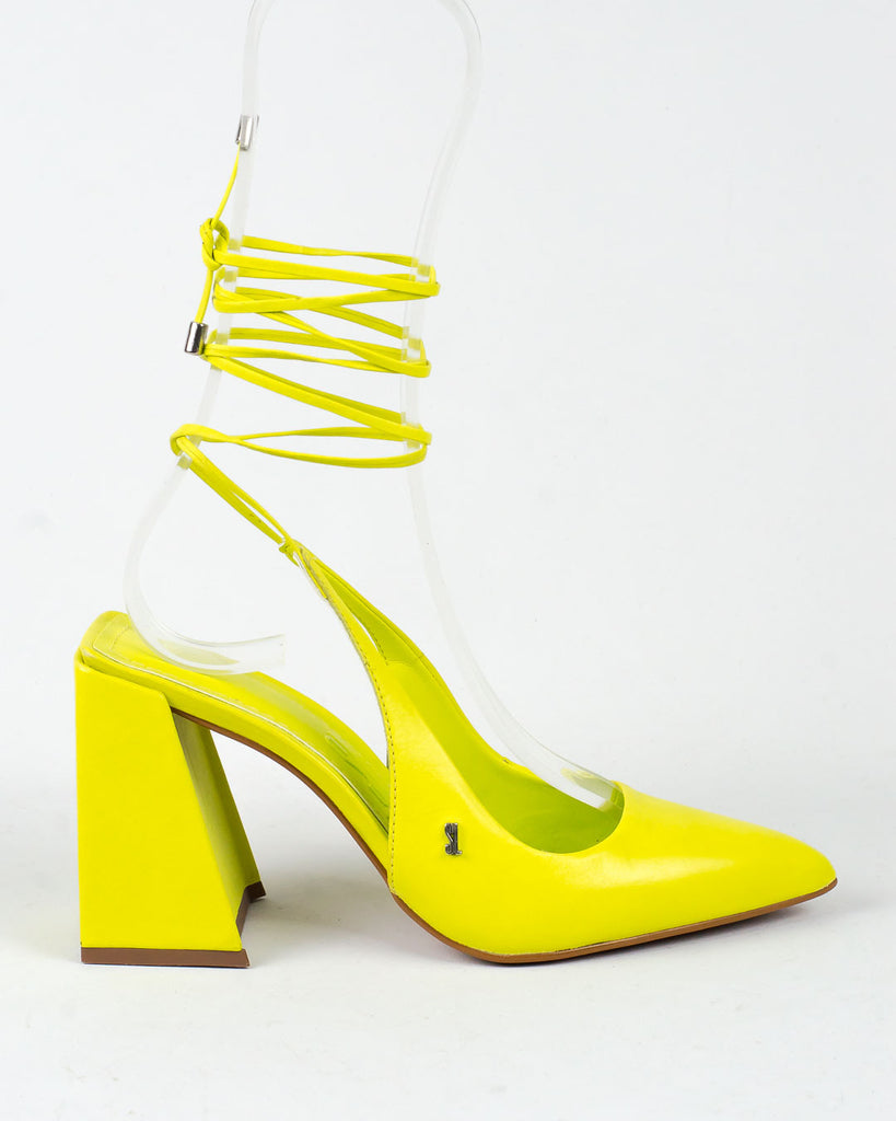 Scarpin Santa Lolla produzido em couro e em cor lima. Possui fechamento em amarração dando possibilidades de uso e estilos. Seu salto grosso garante conforto e segurança. Peça coringa para trazer vida e estilo a qualquer look.
