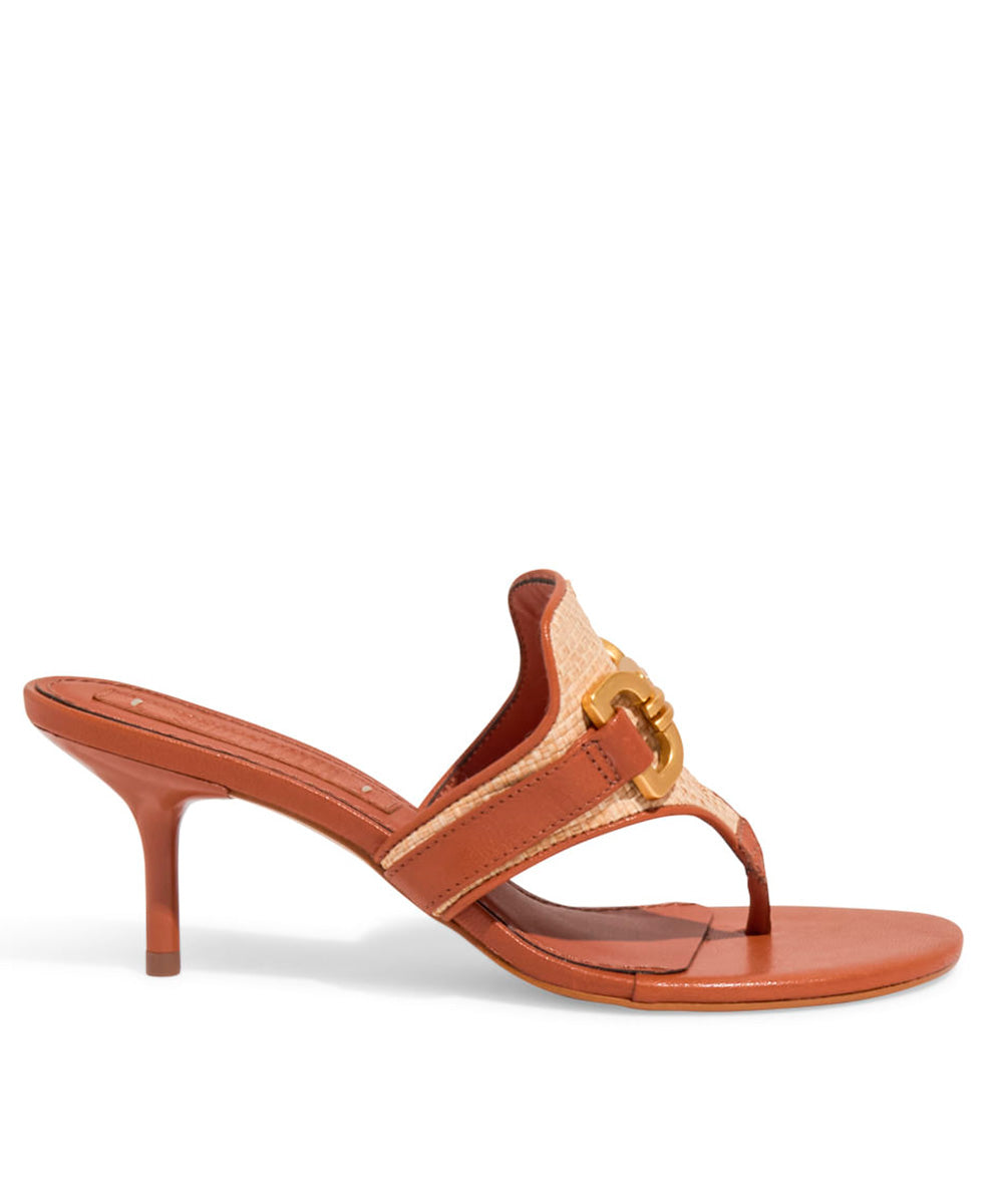 Tamanco bico redondo, confeccionado em couro pelica soft. Possui salto fino médio, tiras finas dividindo os dedos e detalhes em metal dourado na parte frontal, que proporciona uma estética única pelo seu design elegante e moderno.