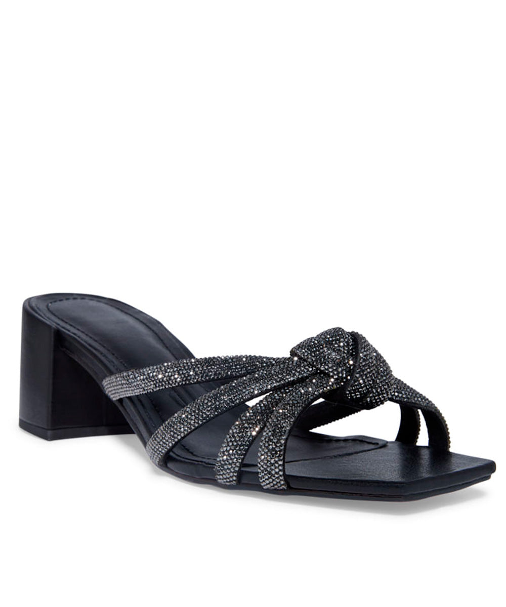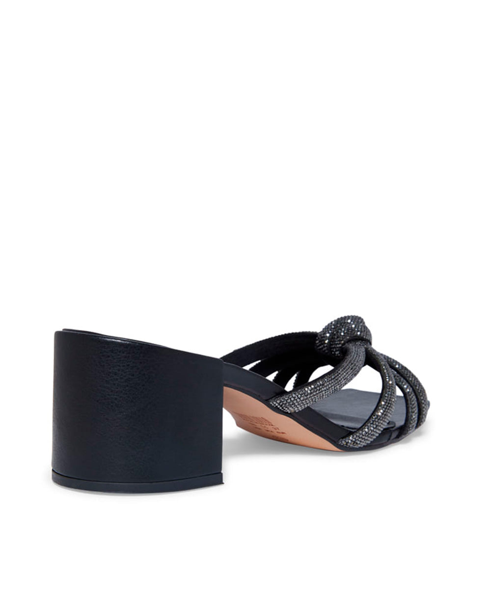 Este modelo de Tamanco une glamour e conforto, com seu design de tiras de strass e detalhe em nó no centro e seu salto baixo, trazendo total comodidade para os pés.